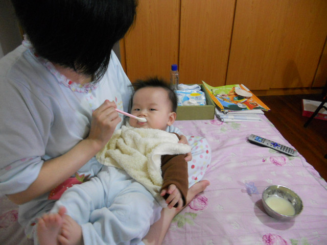 但那麼多的品牌讓媽媽傷透腦筋,查網路,問朋友,甚至跟老闆討論,還是很難決定要買那一種,最後老闆說他先給一小包桂格幼兒多力的試吃看看。剛開始迷你Q並不大捧場,餵一匙,吐半匙的,40c.c.的米精餵了快半小時才吃完。第二天再繼續,有進步些了,大約吃了60c.c.,但一樣”驢”很久,一下子搶湯匙,一下子看旁邊,真累死媽媽了!